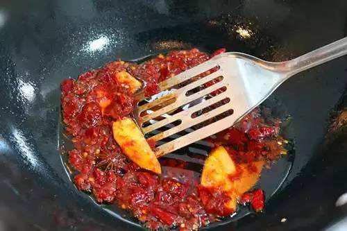 熬制过程中可不时添加少许水,以便降温和防止豆瓣油糊锅,至豆瓣油酥香、色泽红亮、香气浓郁即可出锅,倒人盛器冷却备用即可。