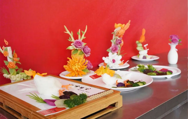 雕刻组教师以“食雕艺术”为载体,将非遗技艺引入课堂。某教师用冬瓜雕刻出“千里江山图”,山峦起伏、树木葱茏,细节栩栩如生;更有教师以南瓜为材,雕刻出“敦煌飞天”造型,衣带飘逸、神态灵动。这些作品不仅展现刀工技艺,更传递出教师对传统文化的敬畏与创新。