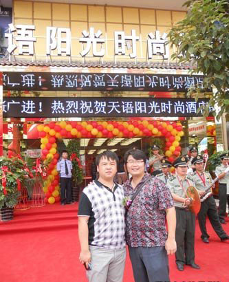 杰出校友杨俊与班主任张雨童老师在开业庆典现场合影